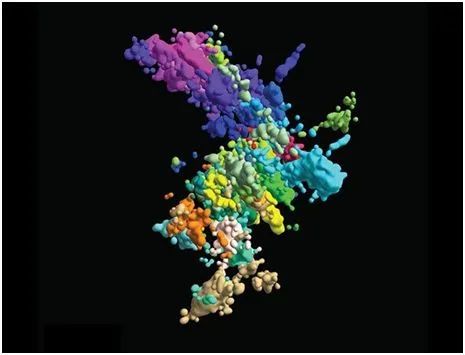 利用多重荧光原位杂交和超分辨率显微镜制作出的彩色染色质图像,图片来自XiaoweiZhuang lab。