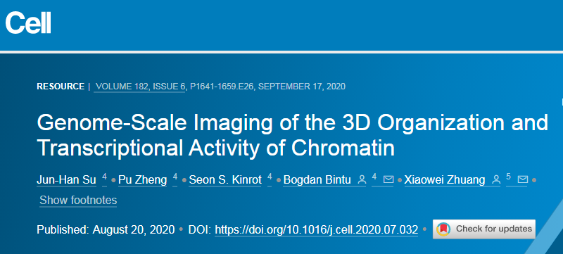 相关研究结果近期发表在Cell期刊上,论文标题为“Genome-Scale Imaging of the 3D Organization and Transcriptional Activity of Chromatin”。