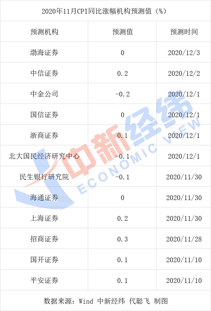 对于即将揭晓的11月份CPI数据,Wind数据显示,截至12月8日,12家机构对11月份CPI同比涨幅的预测均值为0.05%。其中,预测值最大为招商证券给出的0.3%,最低为中金公司给出的-0.2%。