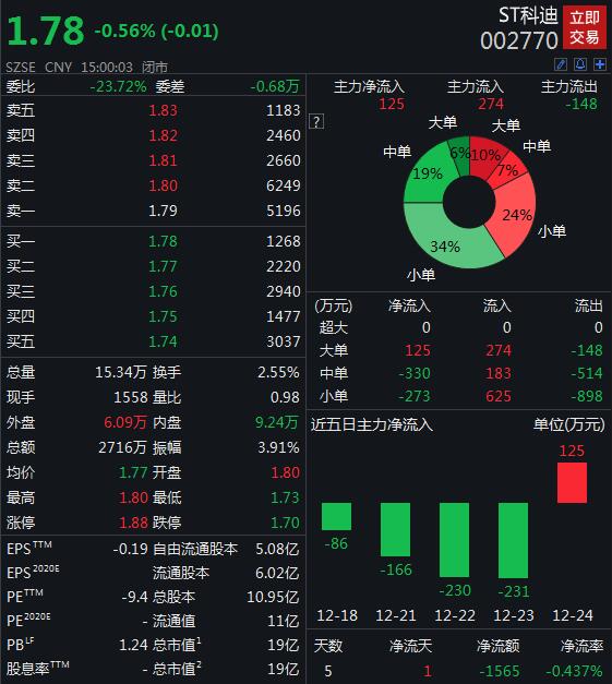 二级市场方面,ST科迪24日报收1.78元/股,跌0.56%,年初至今跌25.83%,现总市值19亿元。(中新经纬APP) |
