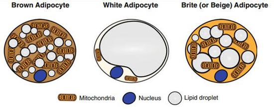 身体内几种脂肪组织类型,棕色脂肪组织(左)、白色脂肪组织(中)、米色脂肪组织(右),mitochondria代表线粒体。