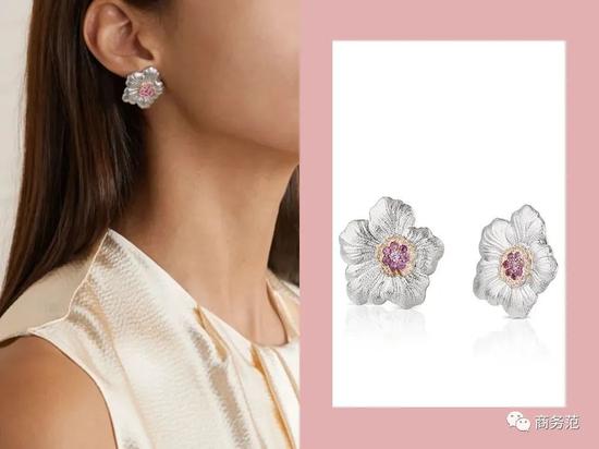 入门可选这款Gardenia纽扣耳环,6颗粉红蓝宝石镶嵌,相当点睛,个头不夸张,日常通勤佩戴也不违和。