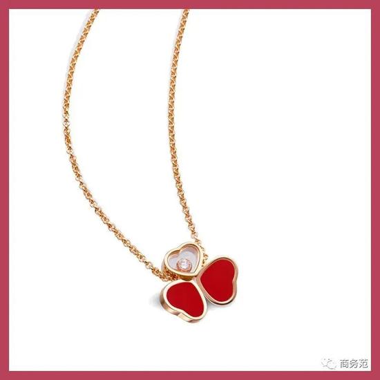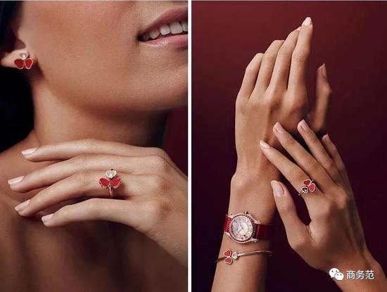 萧邦最近推出的的Happy Hearts Wings系列珠宝特别有节日的氛围,两片红色的桃心设计,仿佛蝴蝶的翅膀一样跃然指尖,动感十足,还有一种喜气洋洋的感觉。
