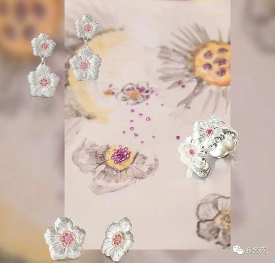 Gardenia珠宝还推出了粉色蓝宝石款式的,粉色花蕊搭配银质花瓣,干净又仙气,风格小众高级,也很不容易撞款。