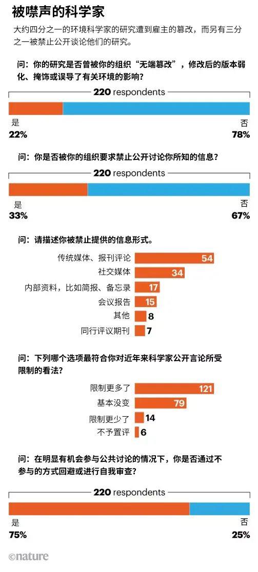 调查结果显示,为政府和产业界工作的科学家感受到的来自雇主的压力大于大学科研人员。在政府雇员中,大约一半的人被禁止公开谈论他们的研究,这个数字在产业界是38%,在大学是9%。四分之三的受访者还表示,他们被要求自我审查(见“被噤声的科学家”)。