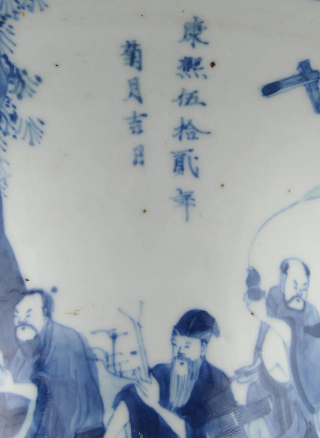 根据“康熙伍拾贰年菊月吉旦”可推出此尊烧造时间应为1713年九月初一,如此精确的确切纪年,对康熙青花瓷器的分段与断代具有重要意义,且底部有堂名款,是一件具有重要学术价值的艺术珍品。 |