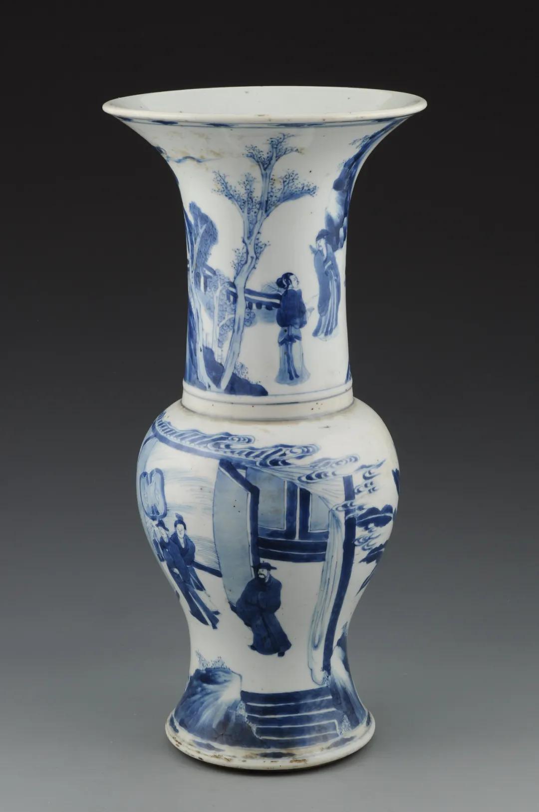 这件清康熙青花人物故事图凤尾尊,尊口呈喇叭状外撇,长颈,鼓腹,束胫,近底处足外撇,二层台式圈足。