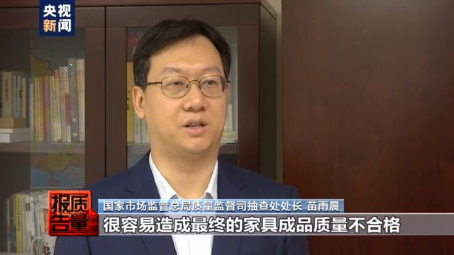 国家市场监管总局质量监督司抽查处处长 苗雨晨:企业的大部分原材料依靠外购,如果原材料质量把关不严,很容易导致最终的家具产品质量不合格。比如使用了甲醛含量高的人造板,可能会造成家具产品甲醛超标,使用了不满足要求的油漆,会造成家具的漆膜理化性能不合格。