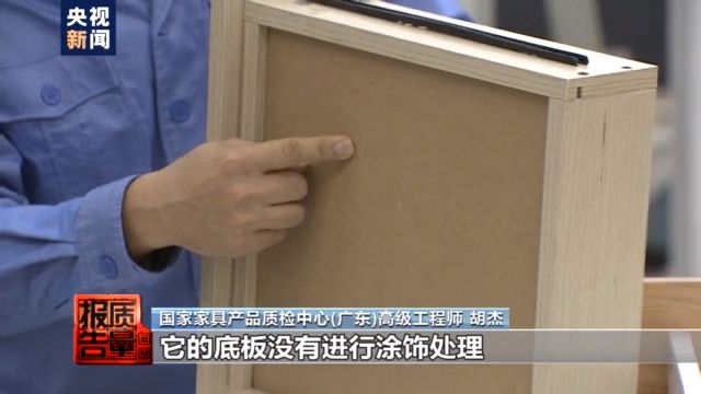 国家家具产品质量监督检验中心(广东)高级工程师 胡杰:这个抽屉的侧板和底板没有进行封边的处理,这个样品是不符合标准要求的。我们再来看一下最后一个,这些地方都进行了封边的处理,但是在一些隐蔽的地方,它的底板没有进行涂饰处理,这个也是不符合标准要求的。