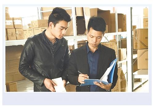 数字化管理师黄祖胜(右)在收集分析客户的线下仓储实时数据,以帮助客户设定优化线上流程。 (受访者供图)