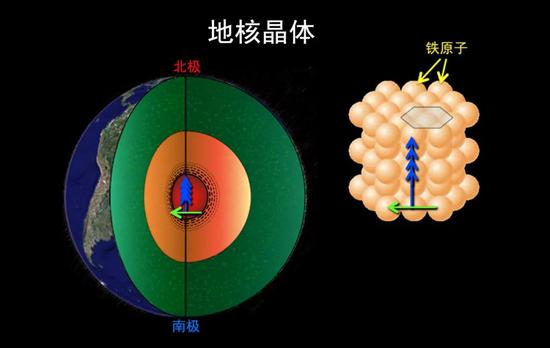 铁的凝结为何会优先地朝着一个方向?研究人员认为,随着铁晶体的生长,重力会将内核中多余的生长从东侧向西侧重新分配。这种在相对柔软的内核中发生的晶体移动,会使晶格沿地球的旋转轴向西排列的程度大于向东排列的程度。