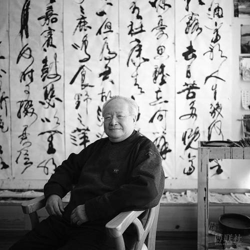 先生八十几岁时,打着赤膊伏在地上,正在为军委大厅书写巨幅书法……