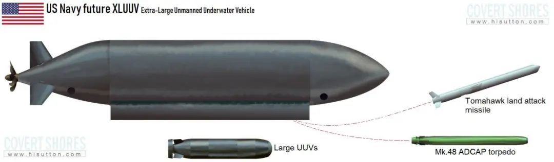 值得注意的是,XLUUV的功能模块中,最优先实现的是水雷战能力。据称,当前美国没有专门的攻击性水雷战装备,直到最近才开始利用轰炸机空投水雷,但效果并不好。根据波音公司公布的概念方案,XLUUV的任务载荷舱将采用类似轰炸机弹舱的底部开口设计,长达10米的舱段可用于携带水雷、重型鱼雷等大型水下作战武器。相比大型核潜艇,它的体积小巧,更难以被发现。通常4艘-9艘XLUUV集群出动,就可在目标港口、海峡等进入水道投送数百吨智能化水雷、战术核水雷,对敌方水面舰船、潜艇进行封锁。