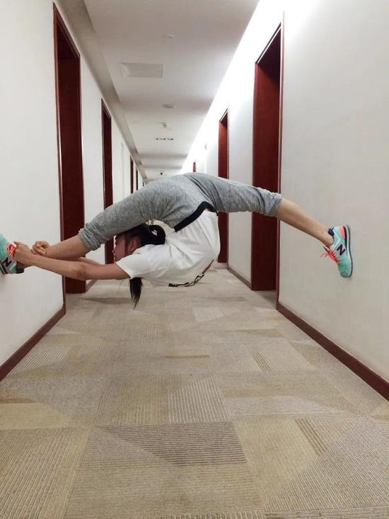 2015年,她在训练之余尝试了倒转一字马的动作——将双腿摆开支撑在过道两侧的墙壁上,身体朝下弯曲,双手固定在一只脚上。