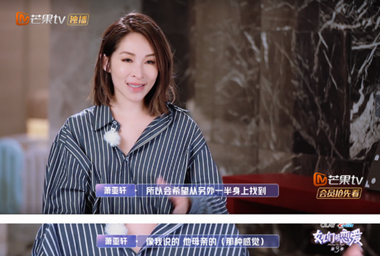 谈过这么多段恋爱的萧亚轩,依然无法轻松的看待两性关系。她曾经表示:“我没有父亲,没看过爸妈的交互相处,妈妈的爱就是一直给,不是双向沟通。”她爱过那么多人,但内心依然孤独,缺乏安全感的她更不敢步入婚姻的殿堂,因为外婆和妈妈的婚姻,都是离婚收场,她害怕重蹈覆辙。