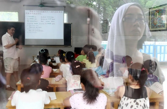 2011年7月7日,江苏省南通市,一名家长头顶毛巾站在教室外隔窗观望正在上“班”的孩子。图/视觉中国