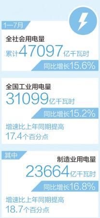 另外,1—7月,全国工业用电量31099亿千瓦时,同比增长15.2%,增速比上年同期提高17.4个百分点,占全社会用电量的比重为66%。其中,制造业用电量保持较快增长。全国制造业用电量23664亿千瓦时,同比增长16.8%,增速比上年同期提高18.7个百分点,高技术及装备制造业、消费品制造业、其他制造业用电增速均高于制造业平均水平。
