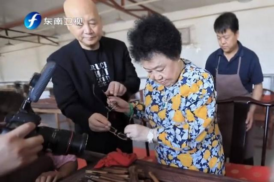 迟陈二人进车间,查看紫檀家具雕刻情况,怕陈丽华看不清,迟重瑞专门递上了眼镜儿;