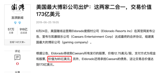 凯撒娱乐前两年被度假村娱乐收购,收购费85亿美元。