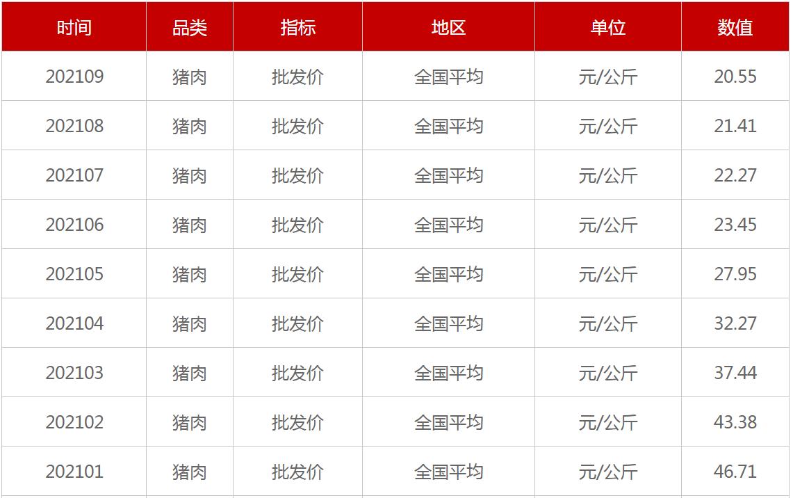 据农业农村部披露的农产品批发价格数据,全国平均猪肉批发价年内逐月走低,从1月份的46.71元/公斤,跌至9月份的20.54元/公斤,区间累计降幅达56%。
