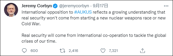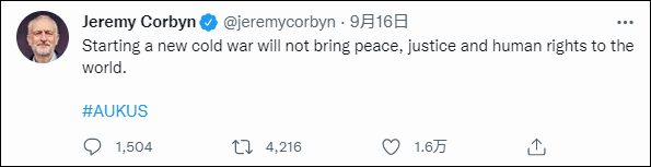 曾任英国工党领袖的杰里米·科尔宾(Jeremy Corbyn)16日带着“AUKUS”字样的标签发推称:“开启新冷战不会给世界带来和平、正义以及人权。”