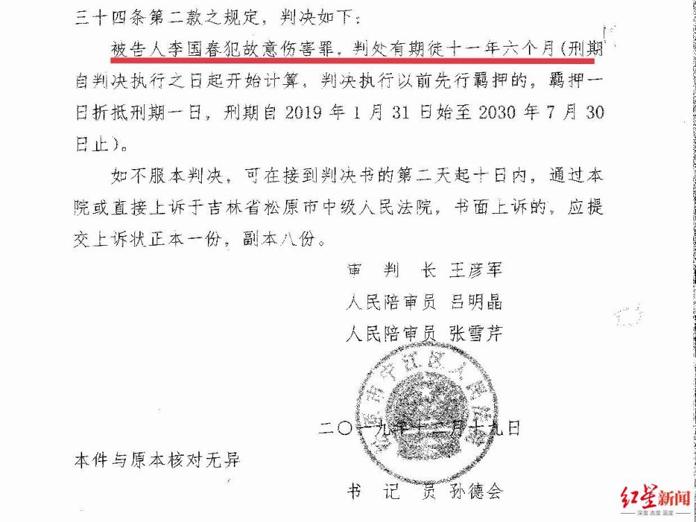 2019年12月19日,松原市宁江区人民法院对李国春故意伤害案作出一审判决:李国春犯故意伤害罪,判处有期徒刑11年6个月。