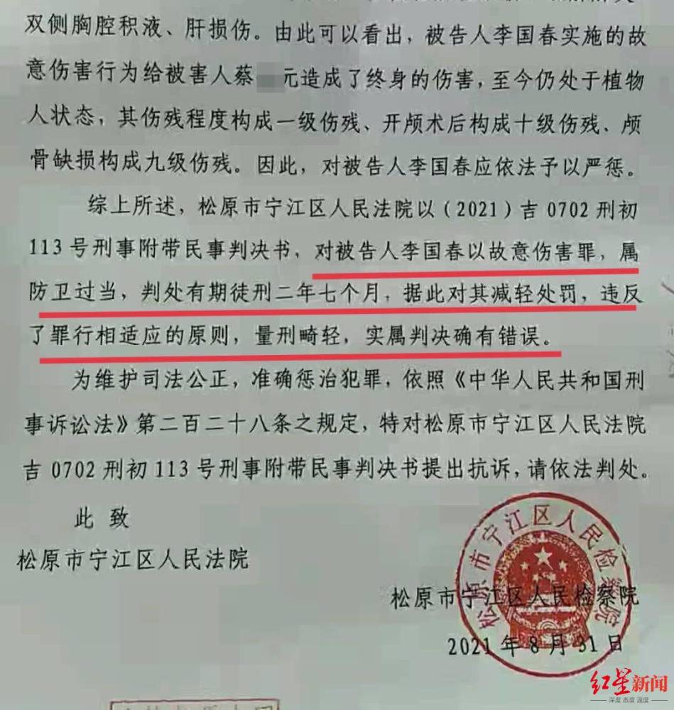 宁江区检察院称,李国春的故意伤害行为,给蔡某元造成了终身的损害,至今仍处于植物人状态,严重影响日常生产生活,具有严重的社会危害性。“为维护司法公正,准确惩治犯罪……提出抗诉,请依法判处。”