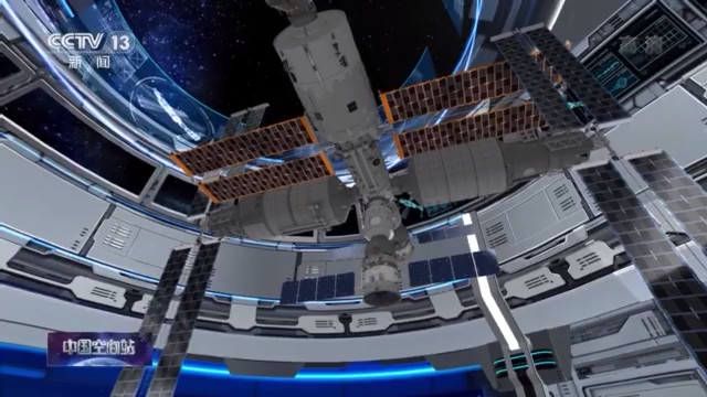 主持人 王言:现在从虚拟动画上也能够看到空间站的全构型,两个实验舱段应该就是看到的左右两边,梦天实验舱和问天实验舱。