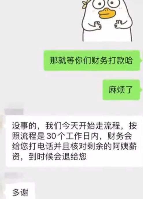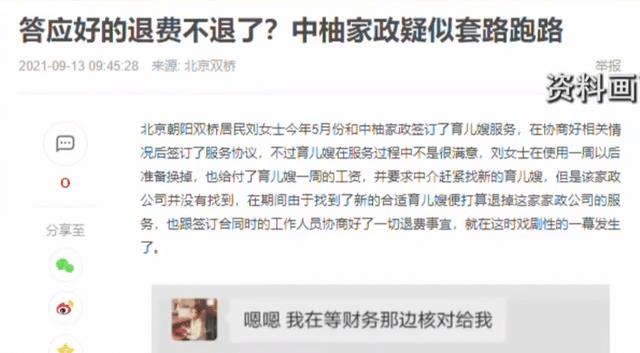 在网上搜索发现,类似杨女士和这家家政公司的纠纷,在网上也有反映。今年六月份,北京的刘女士和家政公司预定了育儿嫂服务,试岗4天后觉得不合适,协商好了退款事宜,费用也迟迟退不回来。