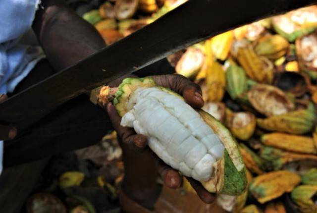 种植户在可可果实里面取出新鲜的可可豆。随着“一带一路”倡议的深入推进,中非经贸往来日益密切。(来源:新华社)