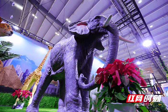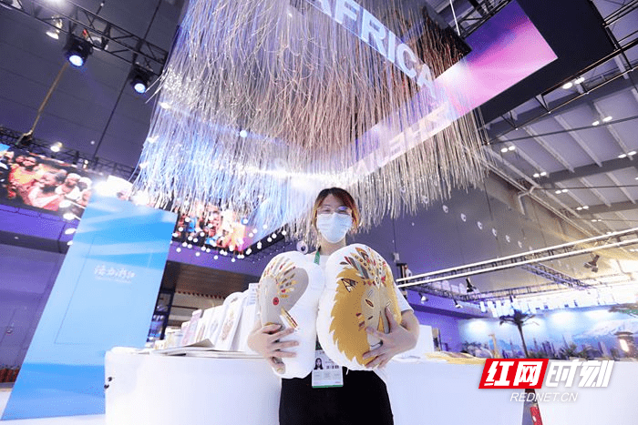 长沙国际会议中心展馆内,工作人员抱着印有非洲动物图案的文创产品。