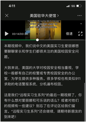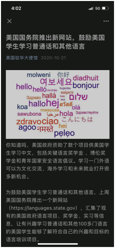 2020年,美国驻华大使馆宣传美国政府鼓励美国学生学习普通话的项目。