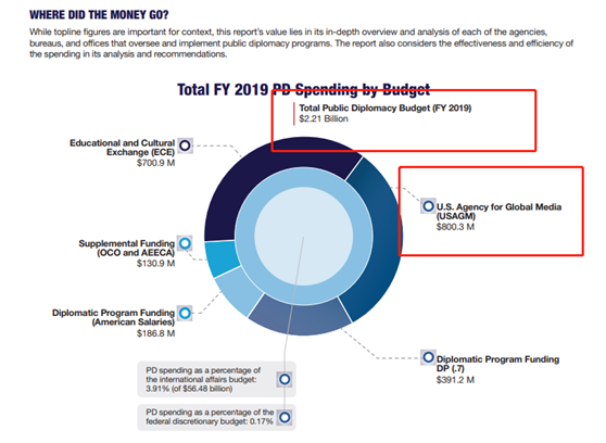 而在同一份报告中,在美国国务院全年的公共外交预算的22.1亿中,分管两大VOA和自由亚洲电台的美国国际媒体署获得了8亿多美元的资金支持,占比超过了三分之一。