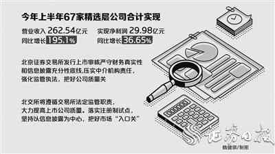 根据监管安排,精选层公司和精选层在审项目都将平移至北交所。10月25日,锦好医疗在精选层挂牌,这是设立北京证券交易所消息发布以来首家在精选层挂牌的企业。至此,精选层企业达67家。据东方财富Choice数据统计,今年上半年,67家精选层公司合计实现营业收入262.54亿元,同比增长195.1%,合计实现净利润29.98亿元,同比增长36.65%。