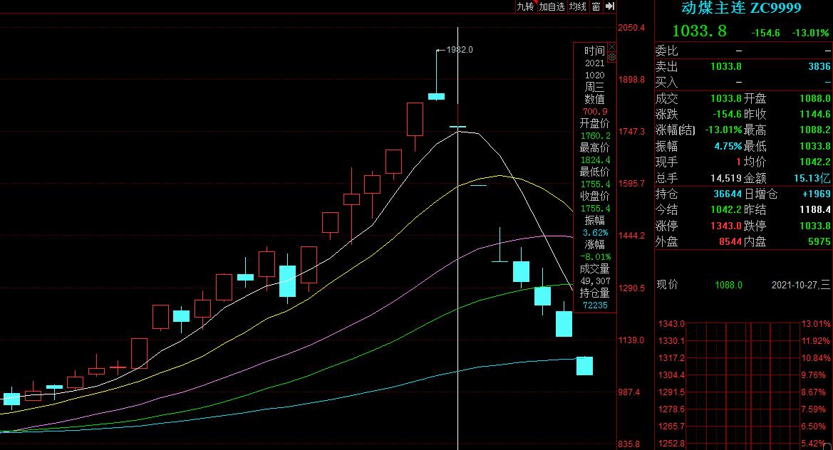 隔夜国内商品期货市场中,截至夜盘收盘,动力煤13%跌停,报价1033.8元/吨,较1982.0元/吨的历史新高跌去47.84%。这是自官方10月19日以来数次出手遏制“煤超疯”后,动力煤期货连续第七个交易日下跌。