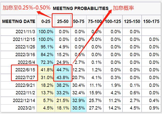 2022年美联储将召开8次议息会议,据芝商所利率观察工具(FedWatch)显示,加息25基点呼声较高的时间是在明年6月及7月,市场押注明年6月15日加息25基点的概率大幅升至44.7%达全年最高,7月27日这一概率小幅回落至43.8%。