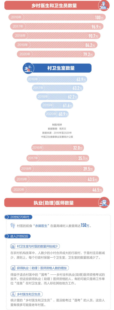 长期跟基层打交道的徐毓才解释说,在农村机构改革中,人数少的小村合并成大的行政村,于是村庄总数减少,原则上,每个行政村保留一个卫生室,卫生室也就减少了。而获得执业(助理)医师资格人数增加,得益于适合村医中的“国考”——乡村全科执业助理医师资格考试的放开。