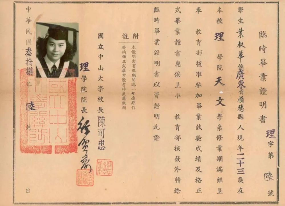 中山大学理学院数学天文系颁给叶叔华的临时毕业证书。