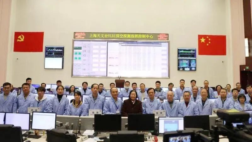 2020年12月17日,嫦娥五号圆满完成我国首次月球采样返回任务。叶叔华(前排左八)和VLBI深空探测指挥控制中心的同事们在一起。