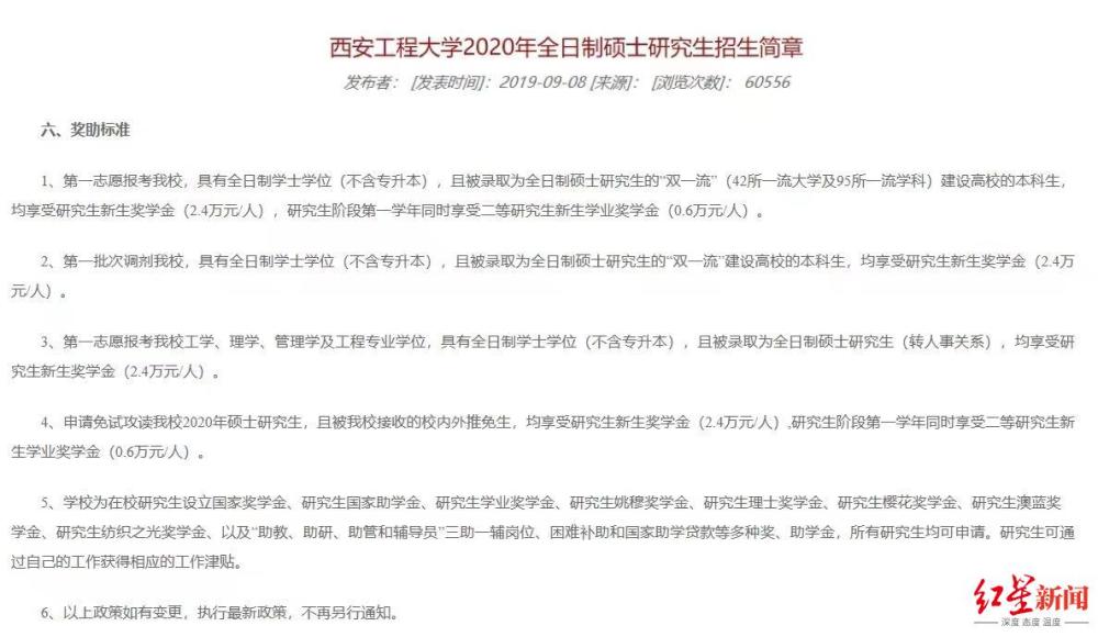 红星新闻记者翻阅了西安工程大学近4年的研究生招生简章。2019年和2020年的简章上均明确显示,第一志愿报考、第一批次调剂该校并被录取为研究生的“双一流”高校本科毕业生;第一志愿报考该校工学、理学、管理学及工程专业学位并被录取的本科毕业生;被该校接收的校内外推免生,均享受研究生新生奖学金2.4万元。