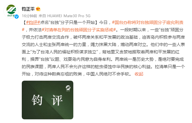 随后,“钧正平”发布微博:一段时期以来,一些“台独”顽固分子极力打击两岸交流合作,破坏两岸关系和平发展的政治基础,迫害岛内积极参与两岸交流的人士和主张两岸统一的力量,竭力抹黑大陆,煽动两岸对立。他们中的一些人表面上“为了台湾人民的福祉积极谋求独立”,背地里又贪婪地攫取着两岸和平发展的红利,操弄“台独”议题、戏耍岛内民意为自身牟利。两岸统一是历史大势,是绝对要完成的民族课题,两岸人民不会允许这样的蛀虫侵蚀中华民族的核心利益。拉清单只是一个开始,对待这种数典忘祖的败类,中国人民绝对不会手软。