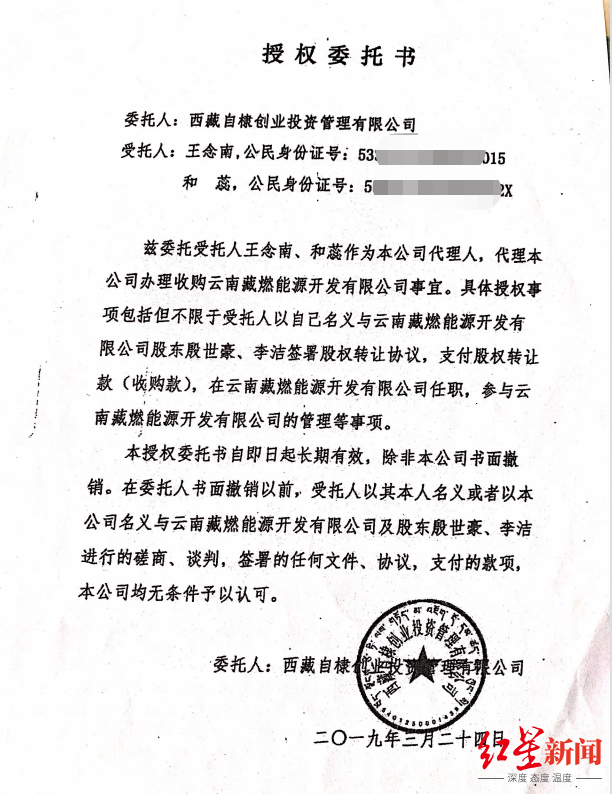 一份落款时间为2019年3月24日的《授权委托书》称,王念南、和蕊二人作为自棣公司的代理人,代理该公司办理收购藏燃公司事宜,“支付股权转让款(收购款),在藏燃公司任职,参与藏燃公司的管理等事项”。
