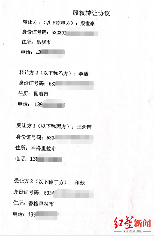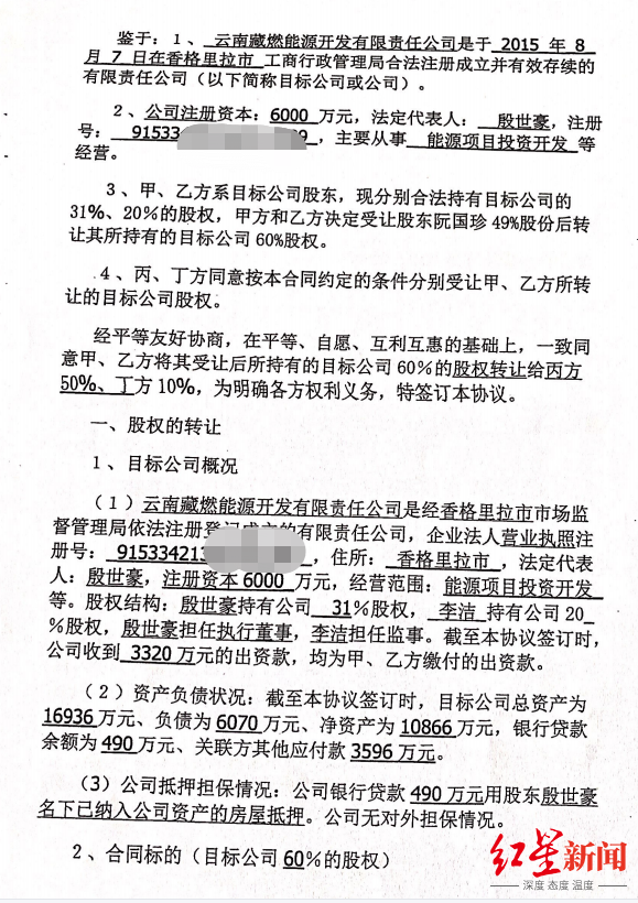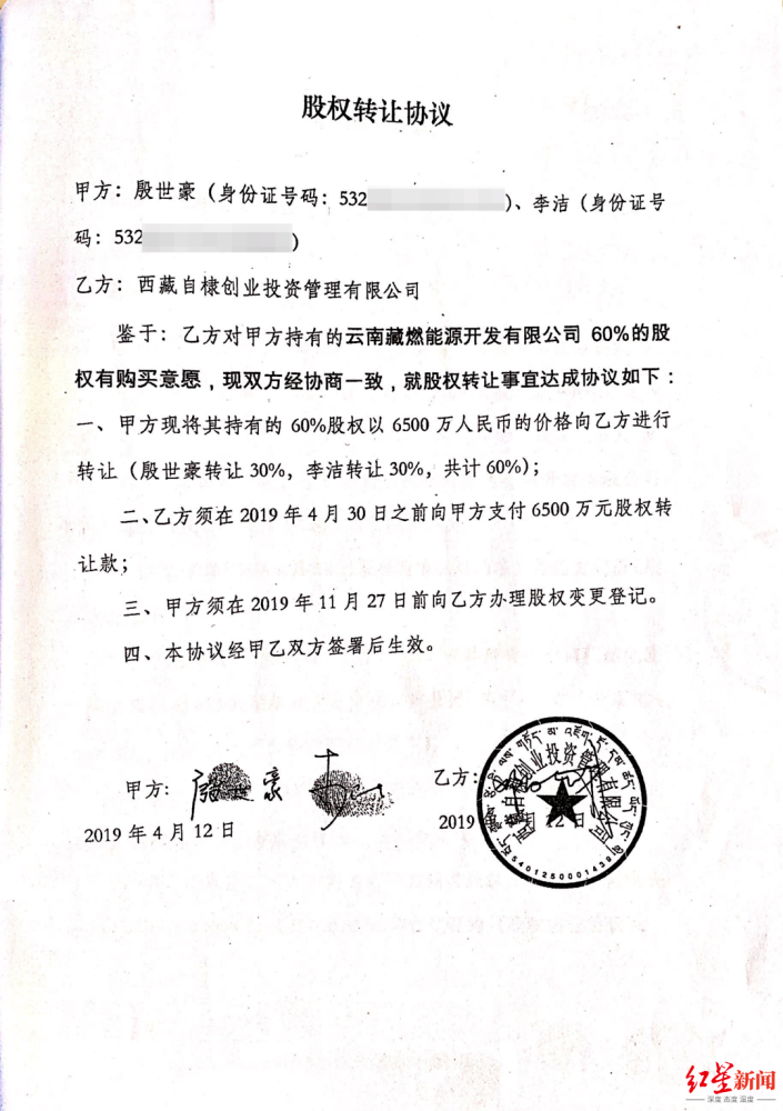 她提到的“地方势力”,即香格里拉市前挂职副市长王念南。一份签订于2019年4月12日的《股权转让协议》(协议一)显示,殷世豪、李洁二人,将云南藏燃公司名下60%的股权,以9980万元的价格,转让给了王念南、和蕊二人。