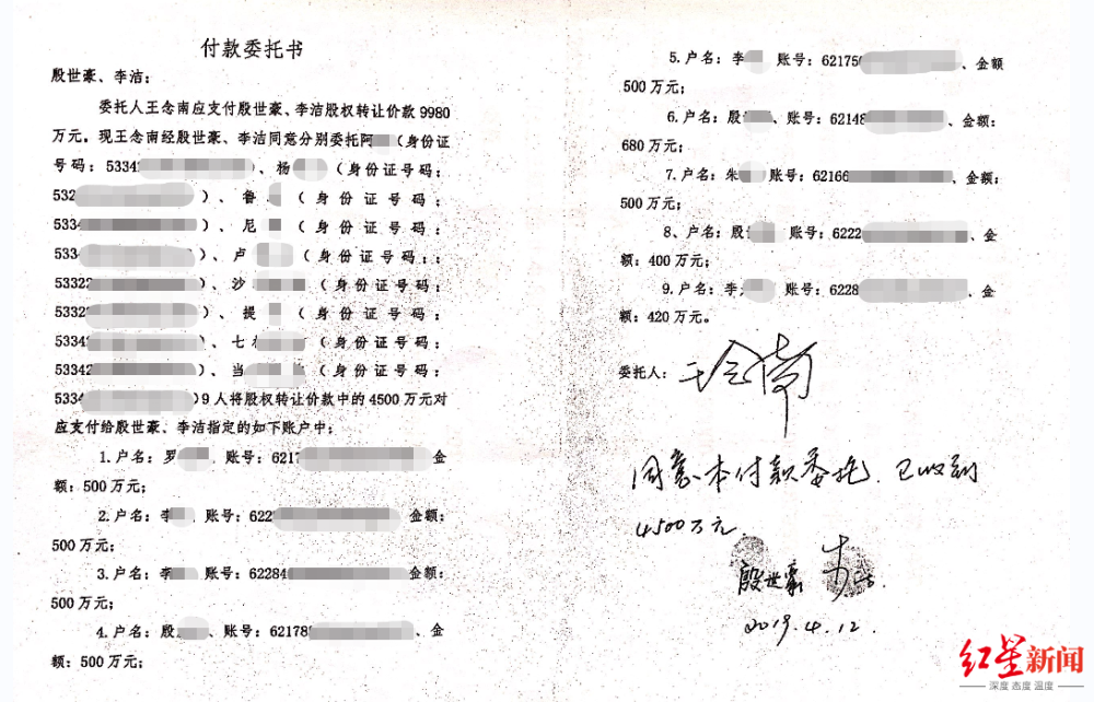 王念南签字委托的《付款委托书》,涉及到9个私人账户。