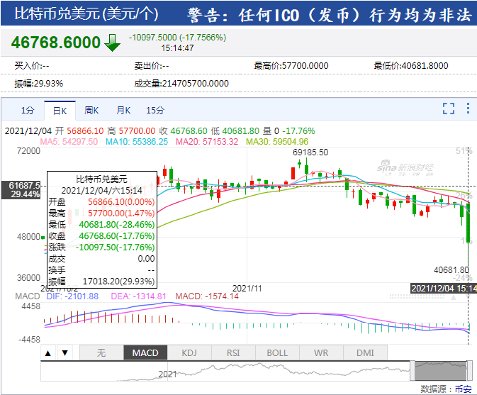 12月1日时,比特币最高价格触及59000美元,接近60000美元高点。但此后便开启了瀑布行情。