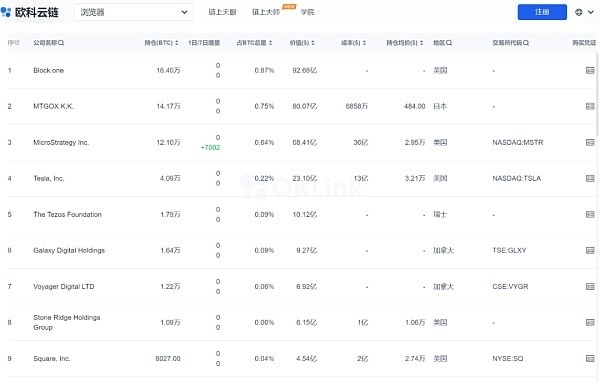 公司持仓比特币情况(部分),数据来源:欧科云链链上大师