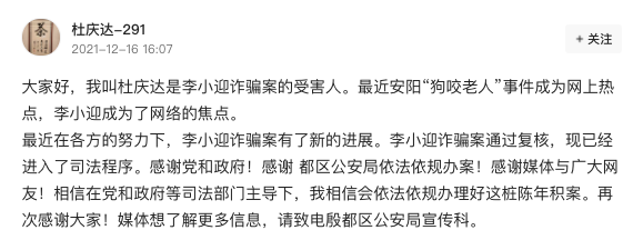 大家好,我叫杜庆达是李小迎诈骗案的受害人。最近安阳“狗咬老人”事件成为网上热点,李小迎成为了网络的焦点。
