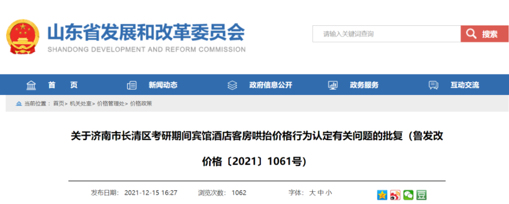 ▲12月15日,山东省发改委批复关于济南市长清区考研期间宾馆酒店客房哄抬价格行为认定有关问题。图/山东省发改委官网截图