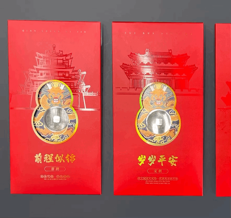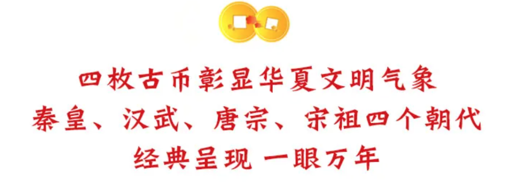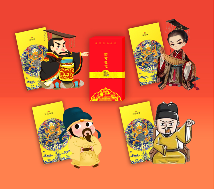 本套《四方来福》古币红包收录了四枚古币,均选取中华文明最具 代表性的秦皇、 汉武、唐宗、 宋祖四个朝代, 经典呈现,一 眼千年。