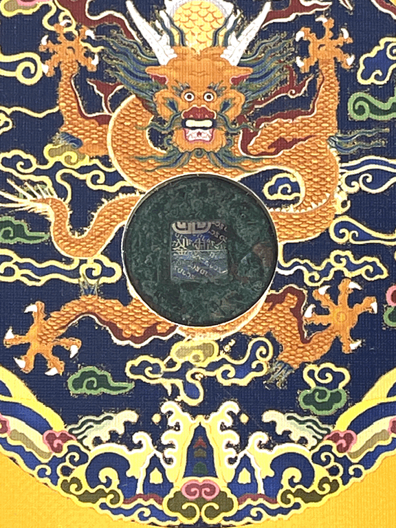 正面蟠龙纹是权利和智慧的象征,寓意福满乾坤、福气满满。搭配海水江崖纹,中国传统纹样寓意绵延不断、福山寿海。